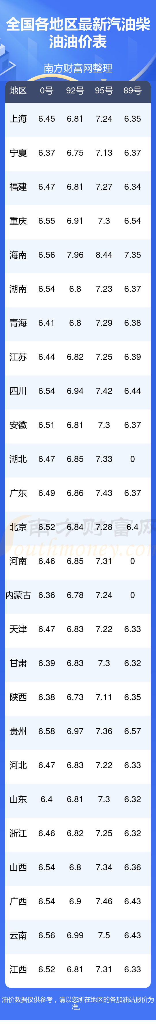 以上油價(jià)信息是當(dāng)前市場(chǎng)上最新油價(jià)信息,油價(jià)數(shù)據(jù)僅供參考,實(shí)際在售油價(jià)可能有小幅偏差,請(qǐng)以您所在地區(qū)的加油站實(shí)際售價(jià)為準(zhǔn)。