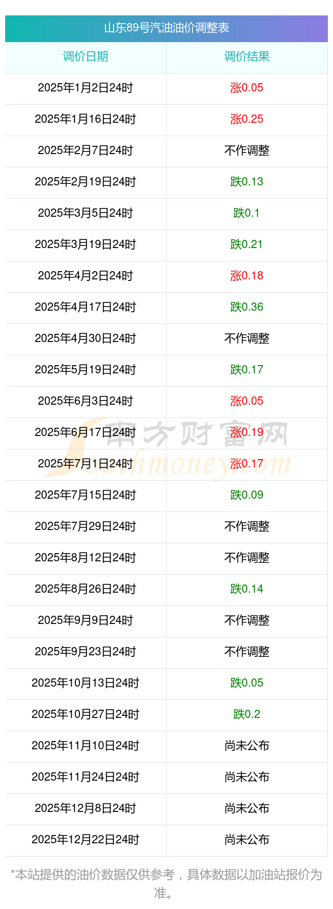 山東日照莒縣11月8日89號汽油歷史油價調整一覽表