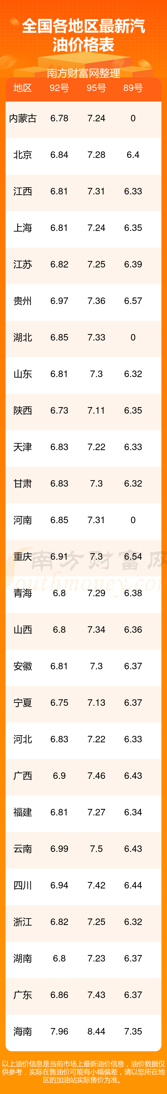 本次油價的調整時間為10月28日,調整后全國92號汽油平均價格為7元每升,其中,最低的是陜西,6.73元每升,最高的是海南,7.96元每升。全國95號汽油平均價格為7元每升,其中,最低的是陜西,7.11元每升,最高的是海南,8.44元每升。全國0號柴油平均價格為:6元每升,其中,最低的是內蒙古,6.36元每升,最高的是貴州,6.58元每升。全國89號汽油平均價格為6元每升,其中,最低的是浙江,6.32元每升,最高的是海南,7.35元每升。,下一輪油價調整時間11月10日24時,距離現(xiàn)在還有2.13天。