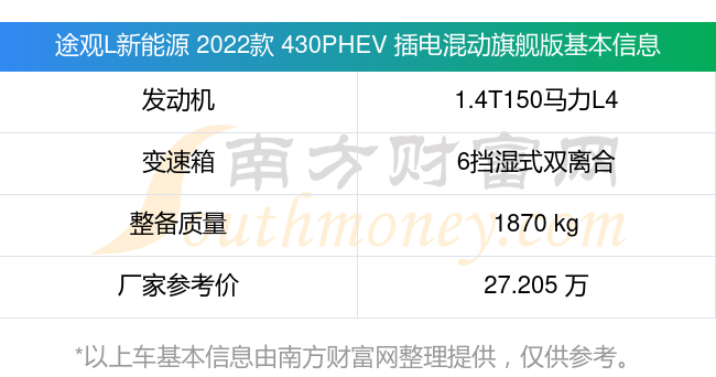 途觀L新能源 2022款 430PHEV 插電混動旗艦版搭載了一臺1.4T150馬力L4渦輪增壓發(fā)動機,采用6擋濕式雙離合自動檔變速箱,常規(guī)整備質(zhì)量1870kg,廠家參考價27.205萬元。