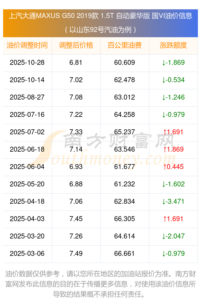 按10月28日92號汽油最新調(diào)整價(jià)格6.81元每升來計(jì)算(以山東為例),該車型百公里平均油費(fèi)為60.609元,按上一輪10月14日調(diào)整價(jià)格7.02元每升來計(jì)算,百公里平均油費(fèi)為62.478元,對比上一輪少花1.869元,下一輪油價(jià)調(diào)整時(shí)間為11月10日24時(shí)。
