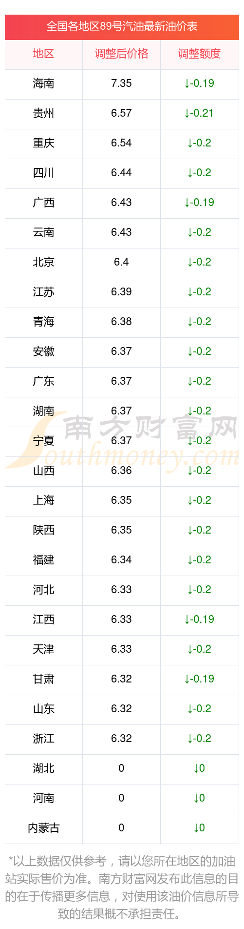 全國各地區(qū)89號(hào)汽油油價(jià)一覽表