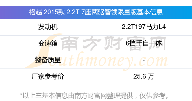 格越 2015款 2.2T 7座兩驅(qū)智領(lǐng)限量版動(dòng)力上搭載的是一臺(tái)2.2T197馬力L4渦輪增壓發(fā)動(dòng)機(jī),匹配6擋手自一體自動(dòng)檔變速箱,燃料形式為柴油,廠家參考價(jià)25.6萬(wàn)元。