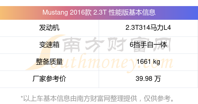 Mustang 2016款 2.3T 性能版動力上配備的是一臺2.3T314馬力L4渦輪增壓發(fā)動機,匹配的是6擋手自一體自動檔變速箱,燃料形式為汽油,常規(guī)整備質量1661kg,廠家參考價39.98萬元。