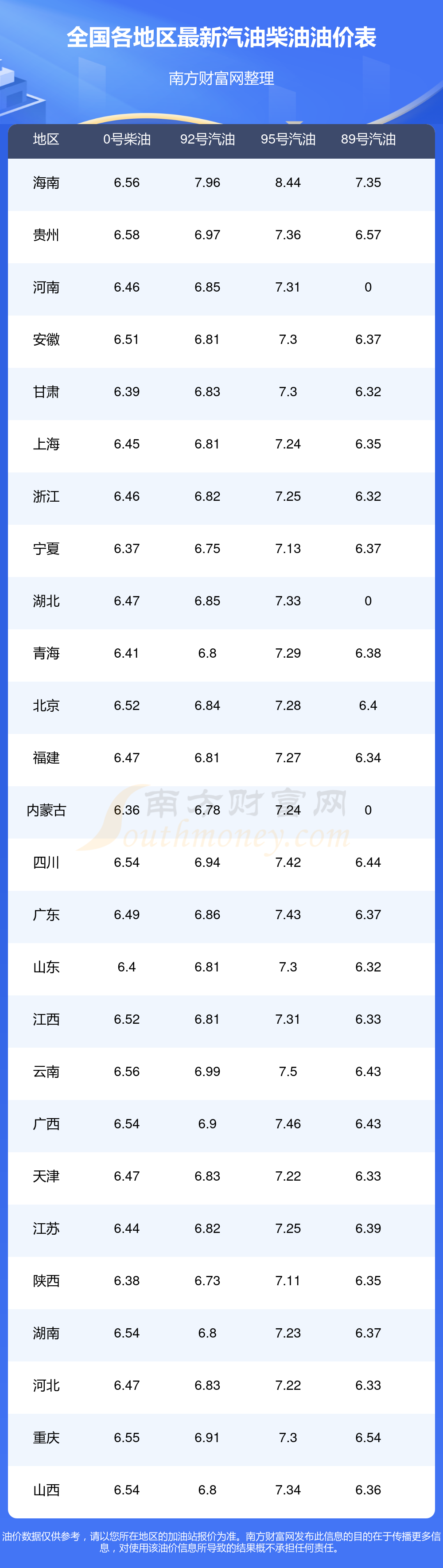全國(guó)89號(hào)汽油平均價(jià)格為:6元每升,其中,最低為浙江,價(jià)格6.32元/升,最高為海南,價(jià)格7.35元/升。