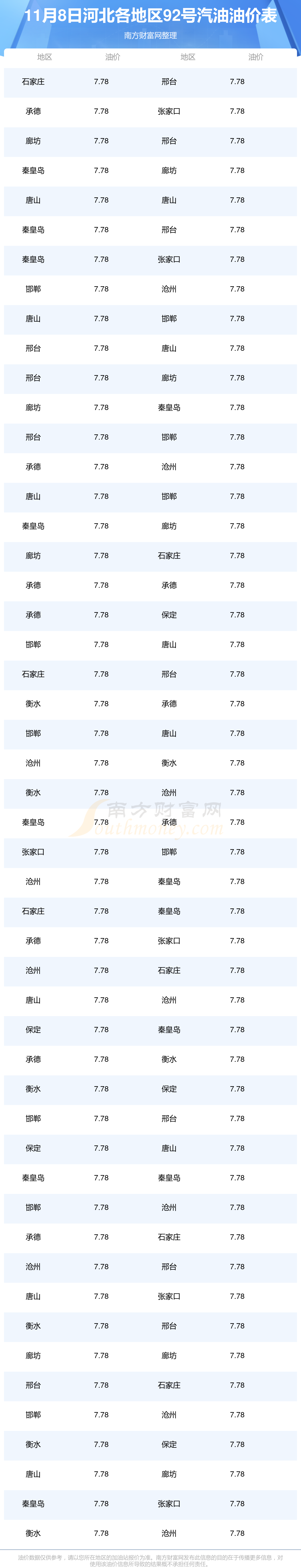 2025年11月8日河北92號(hào)汽油最新價(jià)格一覽表