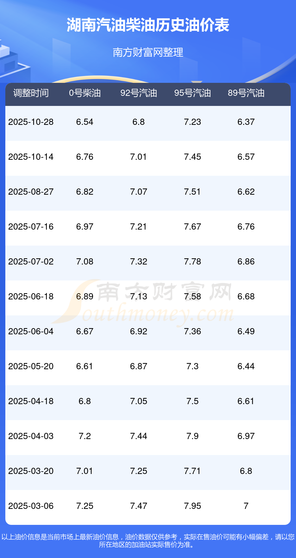 湖南95號(hào)汽油油價(jià)調(diào)整表