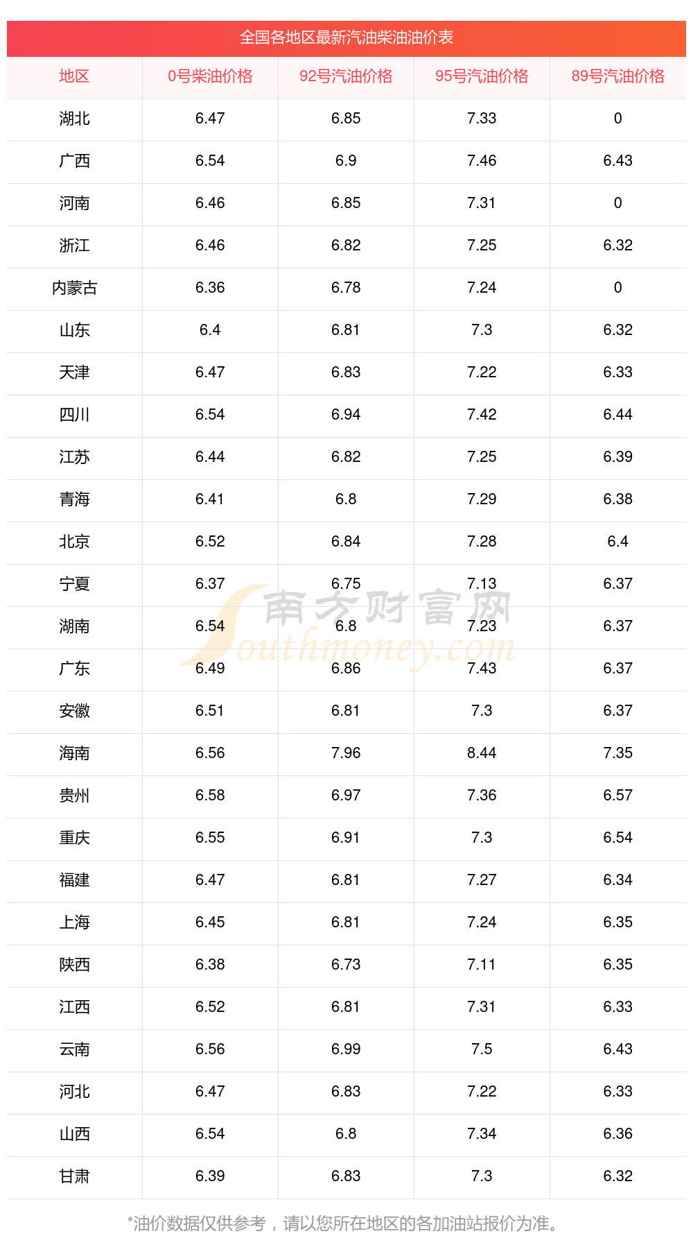 油價調(diào)整最新消息:這一輪油價調(diào)整的時間是10月28日,調(diào)整后全國油價的具體價格為:92號汽油平均價格為7元每升,其中,最低的是陜西,6.73元每升,最高的是海南,7.96元每升。95號汽油平均價格為7元每升,其中,最低的是陜西,7.11元每升,最高的是海南,8.44元每升。0號柴油平均價格為:6元每升,其中,最低的是內(nèi)蒙古,6.36元每升,最高的是貴州,6.58元每升。89號汽油平均價格為6元每升,其中,最低的是浙江,6.32元每升,最高的是海南,7.35元每升。下一輪汽油價格調(diào)整時間11月10日24時,距離現(xiàn)在還有1.87天。