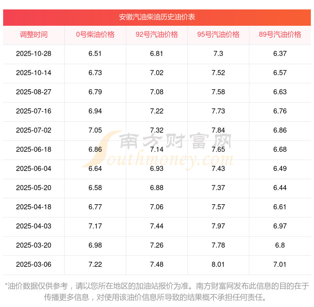 安徽2025年最新汽油柴油歷史油價(jià)表