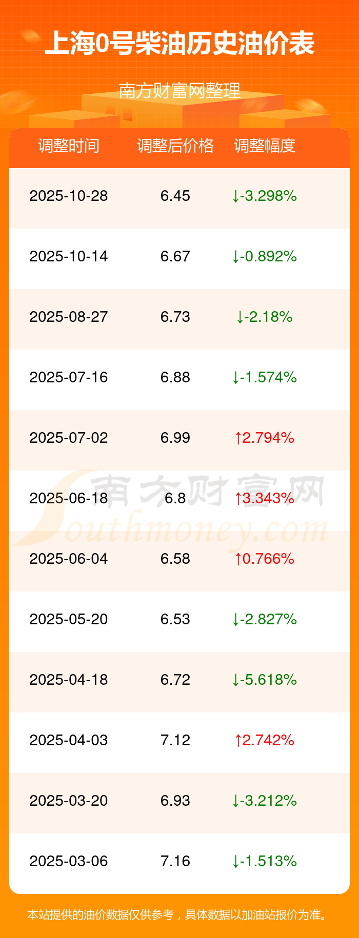 11月9日,上海0號(hào)柴油的價(jià)格是6.45元每升,本次的調(diào)整時(shí)間為10月28日,對(duì)比上次的調(diào)整下跌了0.22元,下跌3.298%,下次調(diào)整時(shí)間為11月10日24時(shí),還有1.82天。