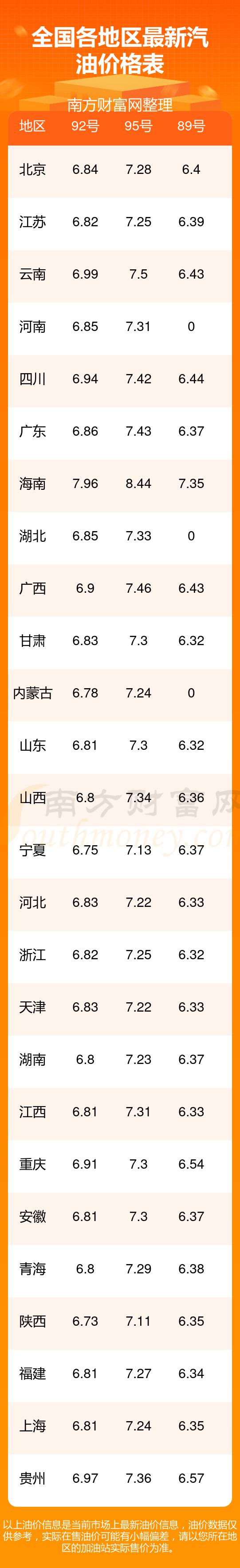 油價(jià)數(shù)據(jù)僅供參考,請(qǐng)以您所在地區(qū)的加油站報(bào)價(jià)為準(zhǔn)。南方財(cái)富網(wǎng)發(fā)布此信息的目的在于傳播更多信息,對(duì)使用該油價(jià)信息所導(dǎo)致的結(jié)果概不承擔(dān)任何責(zé)任。