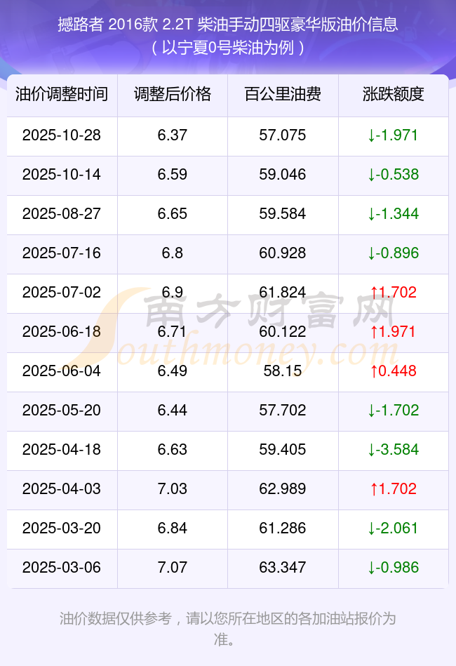 按10月28日0號柴油最新調(diào)整價(jià)格6.37元每升來計(jì)算(以寧夏為例),該車型百公里平均油費(fèi)為57.075元,按上一輪10月14日調(diào)整價(jià)格6.59元每升來計(jì)算,百公里平均油費(fèi)為59.046元,對比上一輪少花1.971元,下一輪油價(jià)調(diào)整時(shí)間為11月10日24時(shí)。