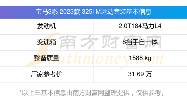 在動(dòng)力方面,寶馬3系 2023款 325i M運(yùn)動(dòng)套裝搭載的是一臺(tái)2.0T184馬力L4渦輪增壓發(fā)動(dòng)機(jī),匹配8擋手自一體自動(dòng)檔變速箱,燃料形式為汽油,常規(guī)整備質(zhì)量1588kg,廠家參考價(jià)31.69萬(wàn)元。