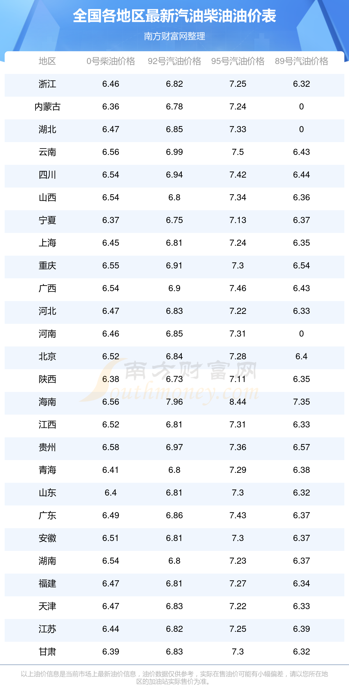 以上油價(jià)信息是當(dāng)前市場(chǎng)上最新油價(jià)信息,油價(jià)數(shù)據(jù)僅供參考,實(shí)際在售油價(jià)可能有小幅偏差,請(qǐng)以您所在地區(qū)的加油站實(shí)際售價(jià)為準(zhǔn)。