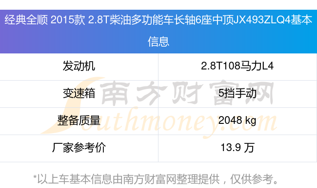 經(jīng)典全順 2015款 2.8T柴油多功能車長軸6座中頂JX493ZLQ4搭載了一臺2.8T108馬力L4渦輪增壓發(fā)動機(jī),采用5擋手動擋變速箱,常規(guī)整備質(zhì)量2048kg,廠家參考價13.9萬元。