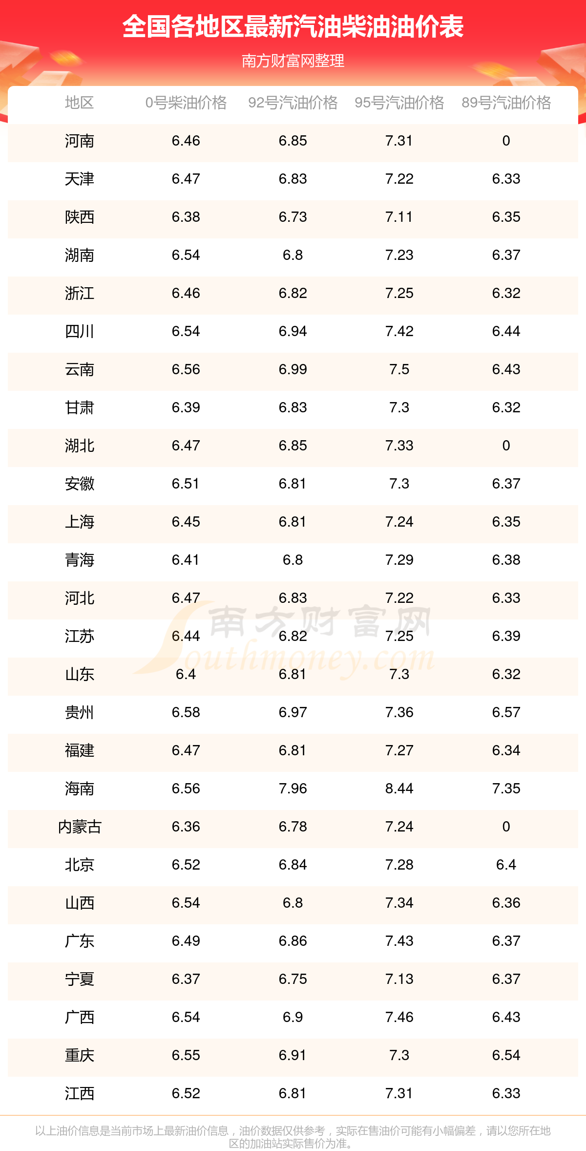 全國(guó)89號(hào)汽油平均價(jià)格為:6元每升,其中,最低為浙江,價(jià)格6.32元/升,最高為海南,價(jià)格7.35元/升。