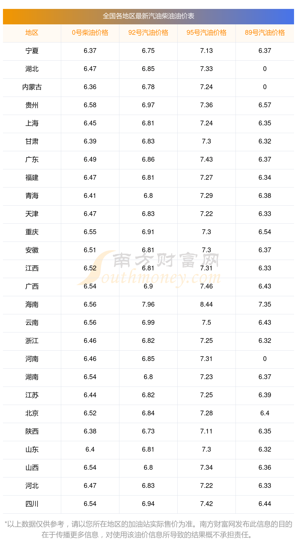 附:最新全國汽油、柴油價格一覽表