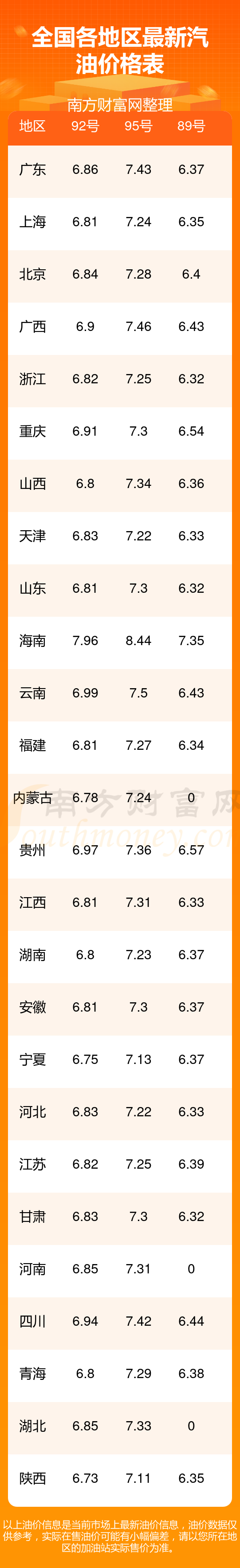 全國(guó)92號(hào)汽油平均價(jià)格為:7元每升,其中,最低為陜西,價(jià)格6.73元/升,最高為海南,價(jià)格7.96元/升。