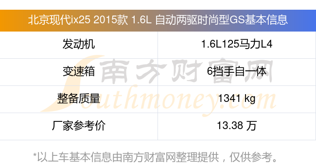 北京現(xiàn)代ix25 2015款 1.6L 自動兩驅(qū)時尚型GS動力方面,搭載的是一臺1.6L125馬力L4自然吸氣發(fā)動機(jī),匹配6擋手自一體自動檔變速箱,燃料形式為汽油,常規(guī)整備質(zhì)量1341kg,廠家參考價13.38萬元。