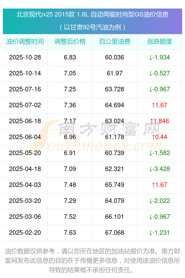 按10月28日92號汽油最新調(diào)整價格6.83元每升來計算(以甘肅為例),該車型百公里平均油費(fèi)為60.036元,按上一輪10月14日調(diào)整價格7.05元每升來計算,百公里平均油費(fèi)為61.97元,對比上一輪少花1.934元,下一輪油價調(diào)整時間為11月10日24時。