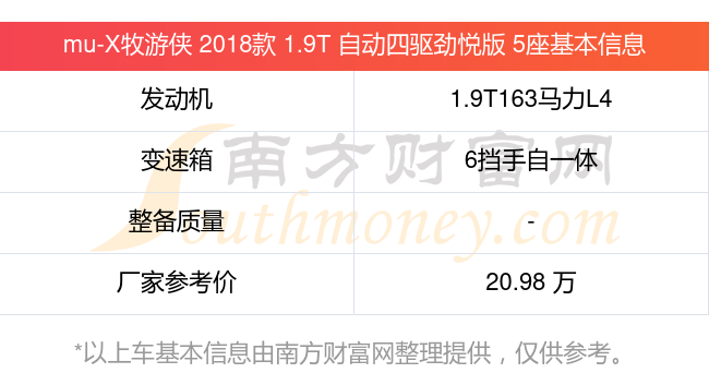 mu-X牧游俠 2018款 1.9T 自動四驅(qū)勁悅版 5座動力上配備的是一臺1.9T163馬力L4渦輪增壓發(fā)動機,匹配的是6擋手自一體自動檔變速箱,燃料形式為柴油,廠家參考價20.98萬元。