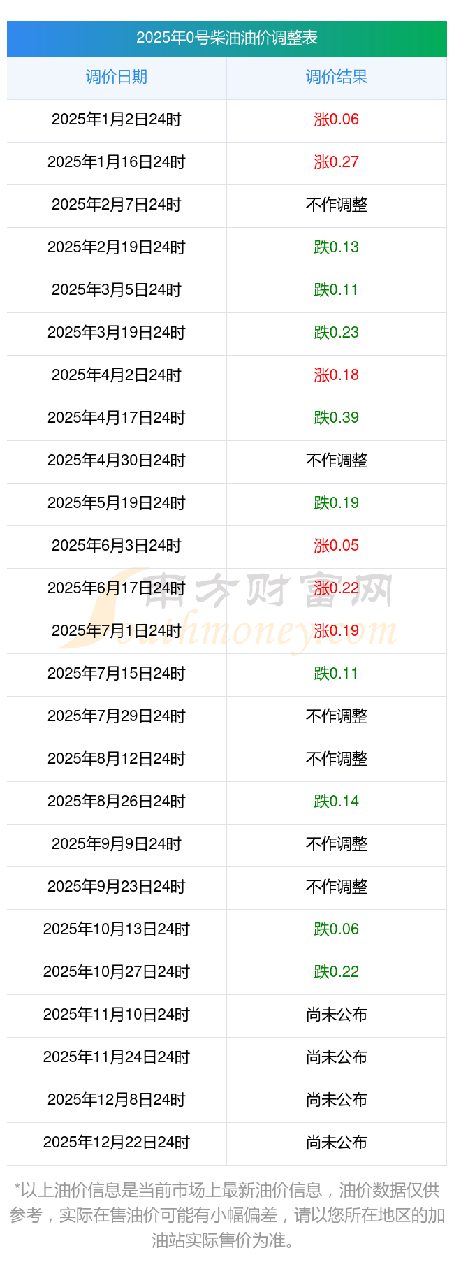 油價(jià)調(diào)整最新消息:11月9日全國(guó)0號(hào)柴油最新平均價(jià)格為6元每升,本次油價(jià)格調(diào)整時(shí)間為10月28日,其中,全國(guó)0號(hào)柴油最低為內(nèi)蒙古,價(jià)格6.36元/升,0號(hào)柴油最高為貴州,價(jià)格6.58元/升。,下一輪汽油價(jià)格調(diào)整時(shí)間11月10日24時(shí),距離現(xiàn)在還有1.6天。