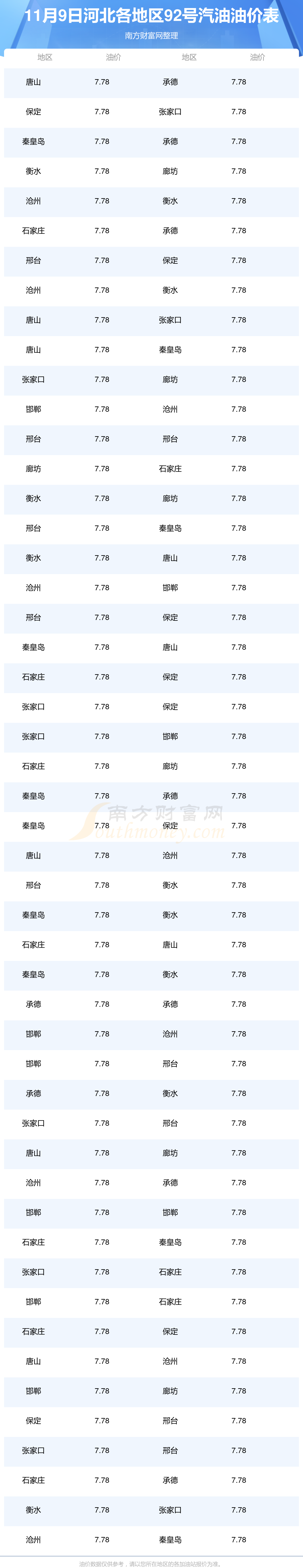 2025年11月9日河北92號(hào)汽油最新價(jià)格一覽表