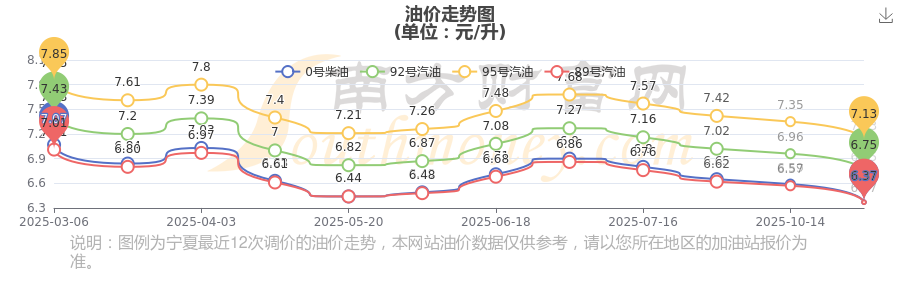 11月9日的銀川汽油、柴油每升最新價格(調整時間為10月28日):92號汽油為6.75元,下降了0.21元,下降幅達3.02%;95號汽油為7.13元,下降了0.22元,下降幅達2.99%;89號汽油為6.37元,下降了0.2元,下降幅達3.04%;0號柴油為6.37元,下降了0.22元,下降幅達3.34%。