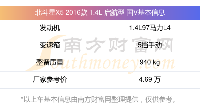 在動力上,北斗星X5 2016款 1.4L 啟航型 國V配備的是一臺1.4L97馬力L4自然吸氣發(fā)動機(jī),匹配的是5擋手動擋變速箱,燃料形式為汽油,常規(guī)整備質(zhì)量940kg,廠家參考價4.69萬元。