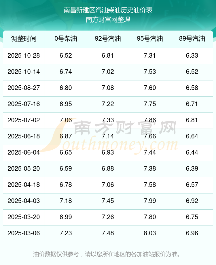 2025年南昌新建區(qū)汽油價(jià)格一覽表
