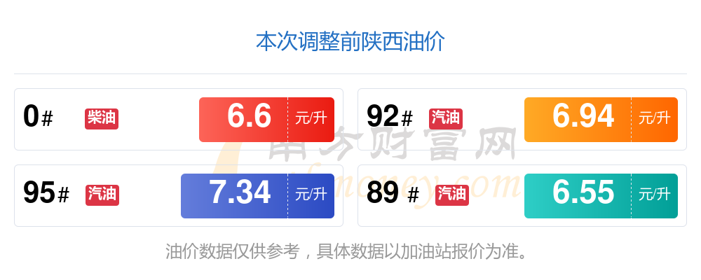 11月9日陜西汽油、柴油的價(jià)格為10月28日調(diào)整后的價(jià)格。每升最新價(jià)格為:92號(hào)汽油6.73元,跌了0.21元;95號(hào)汽油7.11元,跌了0.23元;89號(hào)汽油6.35元,跌了0.2;0號(hào)柴油6.38元,跌了0.22元。