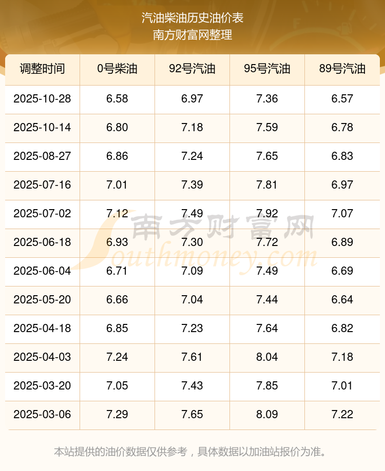 11月9日六盤水92號汽油的價格為6.97元/升,為10月28日油價調(diào)整后的價格,相對上次調(diào)整下跌了0.21元,下跌2.925%。下一輪油價調(diào)整時間11月10日24時,距離現(xiàn)在還有1.56天。
