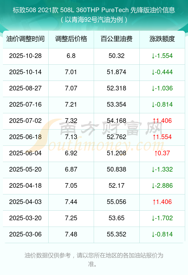 按照10月28日92號汽油最新調(diào)整價格6.8元/升來計算(以青海為例),該車型百公里平均油費為50.32元,按照上一輪10月14日調(diào)整價格7.01元/升來計算,百公里平均油費為51.874元,對比上一輪少花1.554元,下一輪油價調(diào)整時間為11月10日24時。