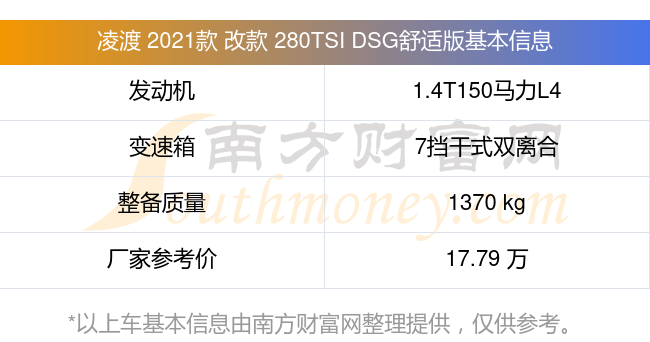 凌渡 2021款 改款 280TSI DSG舒適版動力上配備的是一臺1.4T150馬力L4渦輪增壓發(fā)動機(jī),匹配的是7擋干式雙離合自動檔變速箱,燃料形式為汽油,常規(guī)整備質(zhì)量1370kg,廠家參考價17.79萬元。