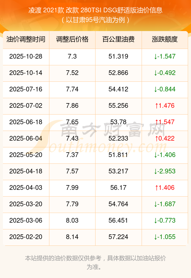按照10月28日95號汽油最新調(diào)整價格7.3元/升來計算(以甘肅為例),該車型百公里平均油費為51.319元,按照上一輪10月14日調(diào)整價格7.52元/升來計算,百公里平均油費為52.866元,對比上一輪少花1.547元,下一輪油價調(diào)整時間為11月10日24時。