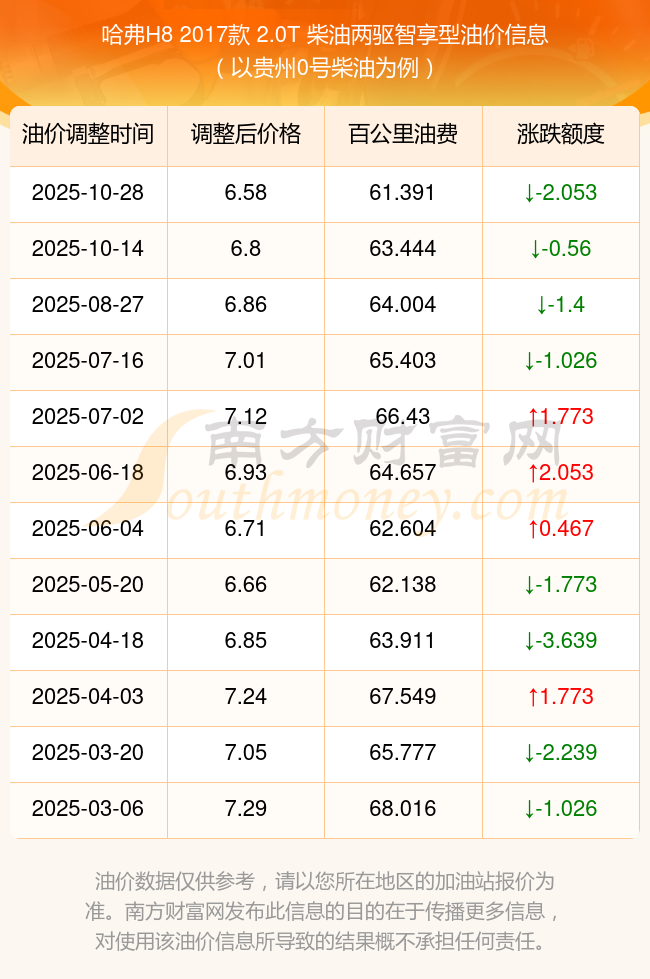 按10月28日0號(hào)柴油最新調(diào)整價(jià)格6.58元每升來(lái)計(jì)算(以貴州為例),該車(chē)型百公里平均油費(fèi)為61.391元,按上一輪10月14日調(diào)整價(jià)格6.8元每升來(lái)計(jì)算,百公里平均油費(fèi)為63.444元,對(duì)比上一輪少花2.053元,下一輪油價(jià)調(diào)整時(shí)間為11月10日24時(shí)。