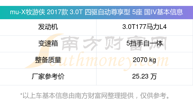 在動力方面,mu-X牧游俠 2017款 3.0T 四驅(qū)自動尊享型 5座 國IV搭載的是一臺3.0T177馬力L4渦輪增壓發(fā)動機,匹配5擋手自一體自動檔變速箱,燃料形式為柴油,常規(guī)整備質(zhì)量2070kg,廠家參考價25.23萬元。