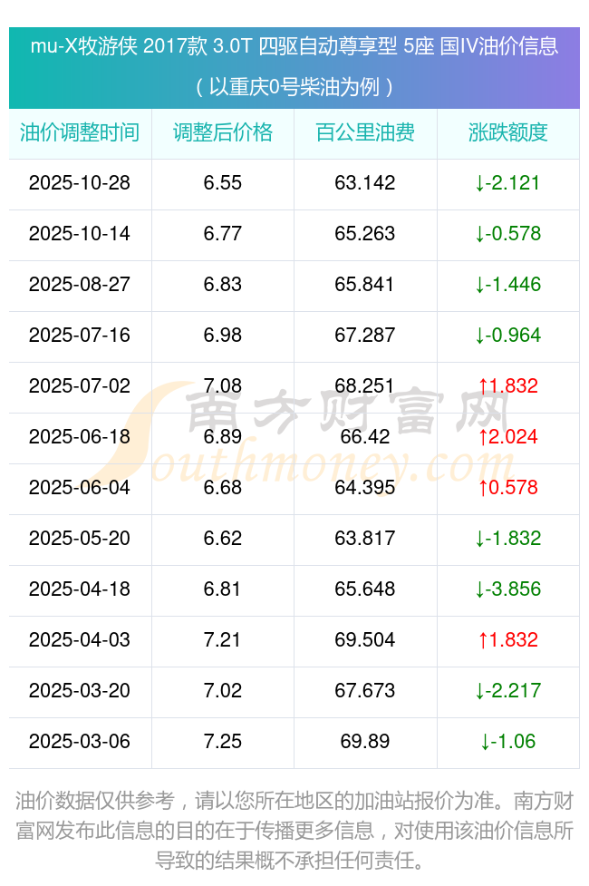 按照10月28日0號柴油最新調(diào)整價格6.55元/升來計算(以重慶為例),該車型百公里平均油費為63.142元,按照上一輪10月14日調(diào)整價格6.77元/升來計算,百公里平均油費為65.263元,對比上一輪少花2.121元,下一輪油價調(diào)整時間為11月10日24時。