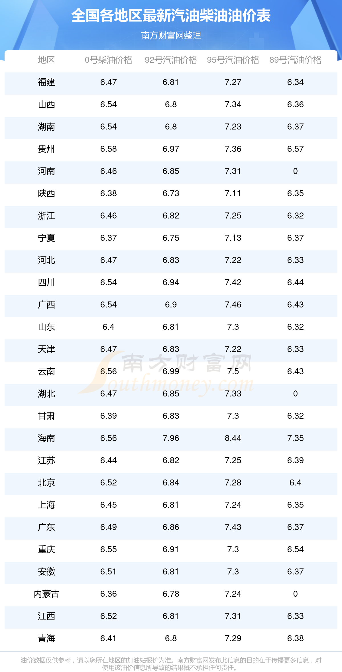 以上數(shù)據(jù)僅供參考,請以您所在地區(qū)的加油站實(shí)際售價為準(zhǔn)。南方財富網(wǎng)發(fā)布此信息的目的在于傳播更多信息,對使用該油價信息所導(dǎo)致的結(jié)果概不承擔(dān)責(zé)任。