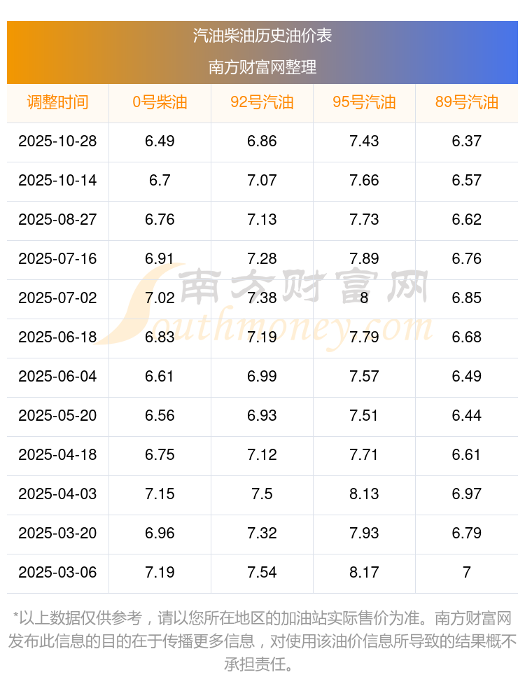2025年95號(hào)汽油價(jià)格一覽表