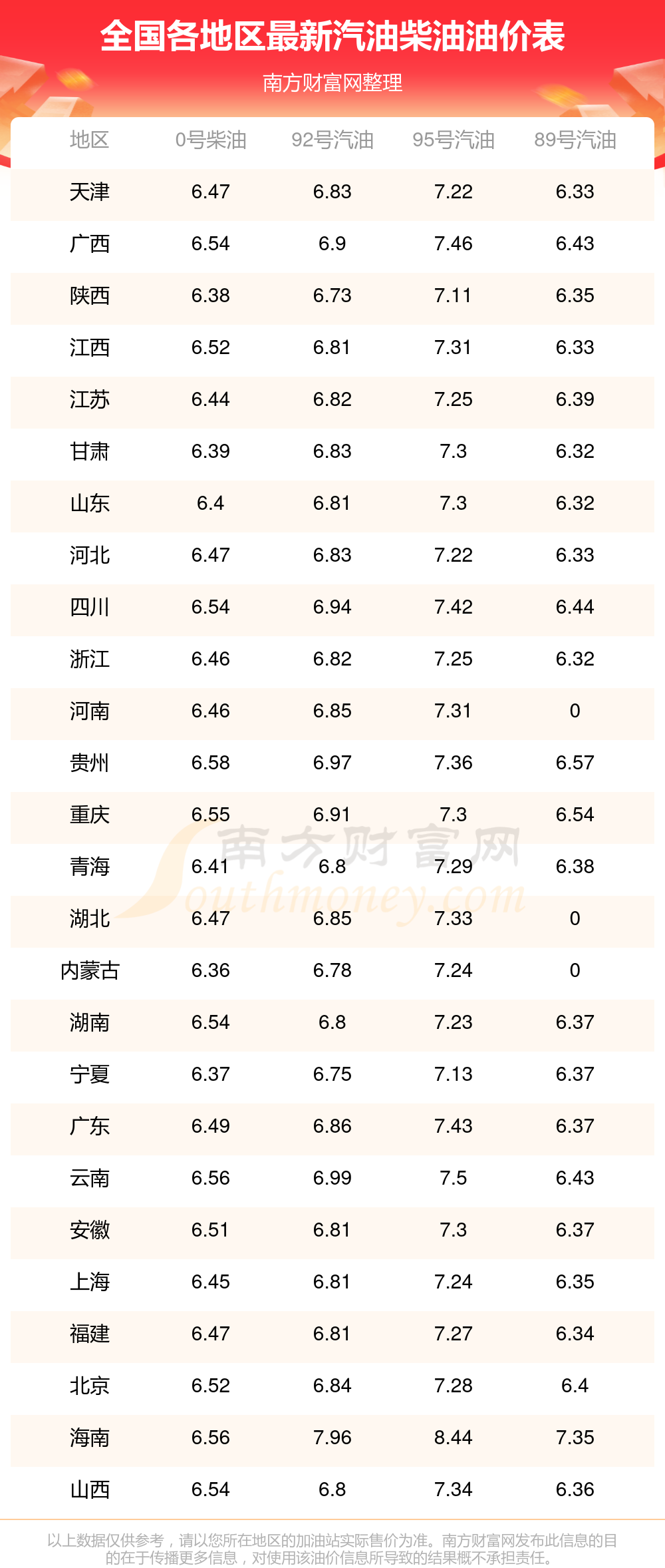 全國0號柴油11月9日的最新價格是10月28日油價調(diào)整后的價格,當(dāng)中,平均價格為6元/升,最低的是內(nèi)蒙古,價格6.36元/升,最高的是貴州,價格6.58元/升。,下一輪油價調(diào)整時間11月10日24時,距離現(xiàn)在還有1.52天。