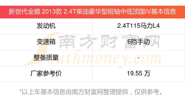 在動(dòng)力上,新世代全順 2013款 2.4T柴油豪華型短軸中低頂國(guó)IV配備的是一臺(tái)2.4T115馬力L4渦輪增壓發(fā)動(dòng)機(jī),匹配的是6擋手動(dòng)擋變速箱,燃料形式為柴油,廠家參考價(jià)19.55萬(wàn)元。