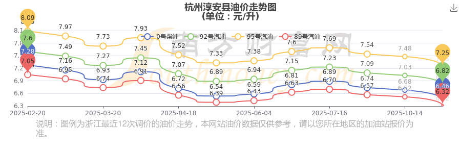 杭州淳安縣汽油、柴油11月9日每升的價(jià)格為10月28日調(diào)整后的價(jià)格:92號(hào)汽油6.82元;95號(hào)汽油7.25元;89號(hào)汽油6.32元;0號(hào)柴油6.46元。