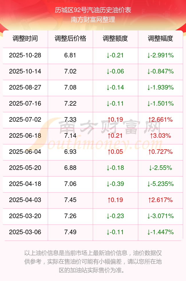 11月9日歷城區(qū)92號(hào)汽油的價(jià)格是6.81元/升,油價(jià)于10月28日調(diào)整,相對(duì)上次調(diào)整時(shí)間10月14日的油價(jià)7.02元每升,共下跌了0.21元,下跌幅達(dá)2.991%。