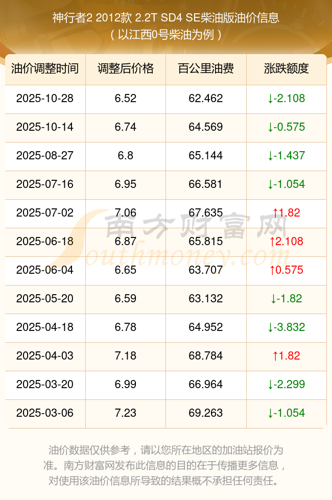 按10月28日0號柴油最新調(diào)整價格6.52元每升來計算(以江西為例),該車型百公里平均油費為62.462元,按上一輪10月14日調(diào)整價格6.74元每升來計算,百公里平均油費為64.569元,對比上一輪少花2.108元,下一輪油價調(diào)整時間為11月10日24時。