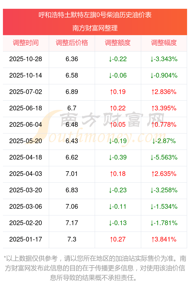 11月9日呼和浩特土默特左旗0號柴油歷史油價調整一覽表