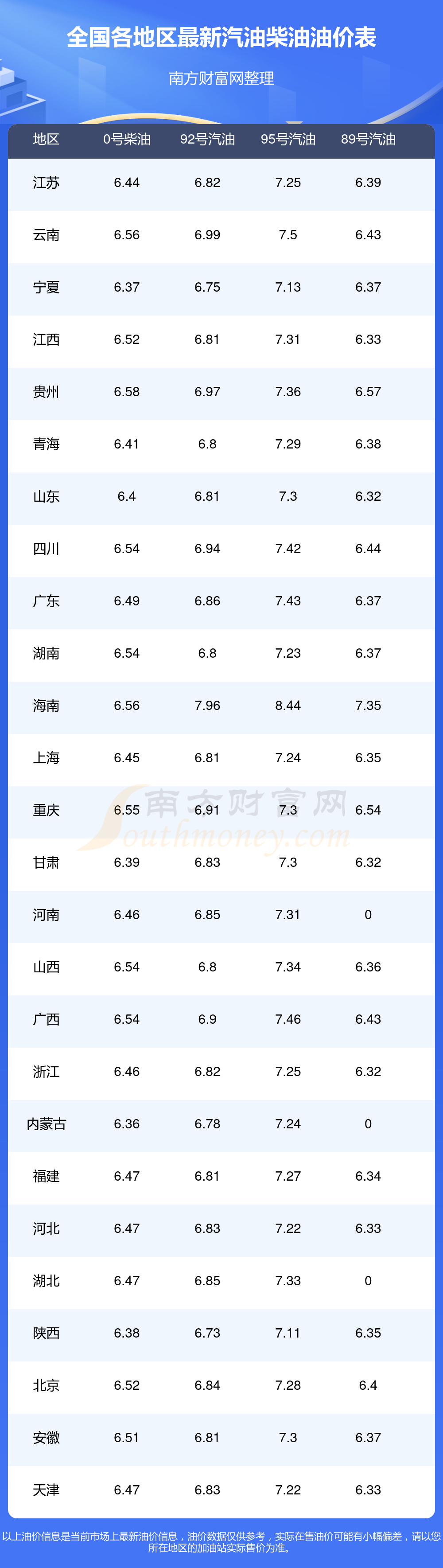 以上數(shù)據(jù)僅供參考,請以您所在地區(qū)的加油站實際售價為準。南方財富網(wǎng)發(fā)布此信息的目的在于傳播更多信息,對使用該油價信息所導致的結(jié)果概不承擔責任。