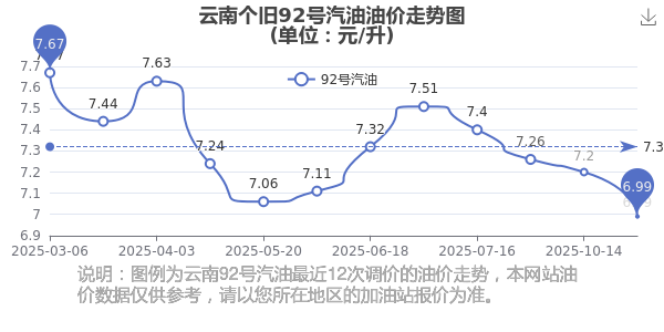 11月9日云南個舊汽油柴最新油價是多少?具體每升為:10月28日調(diào)整后,92號汽油為6.99元,下跌了0.21元,下跌幅達2.92%;95號汽油為7.5元,下跌了0.23元,下跌幅達2.98%;89號汽油為6.43元,下跌了0.2元,下跌幅達3.02%;0號柴油為6.56元,下跌了0.21元,下跌幅達3.1%。下一輪油價調(diào)整時間11月10日24時,距離現(xiàn)在還有1.43天。