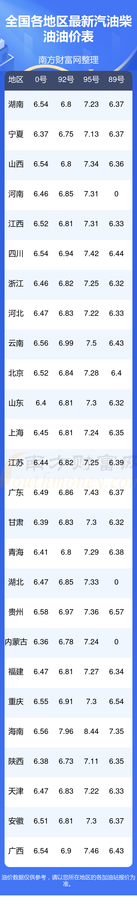 全國各地區(qū)最新油價表