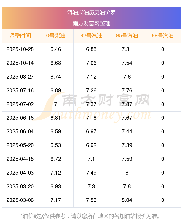 2025年92號(hào)汽油價(jià)格一覽表